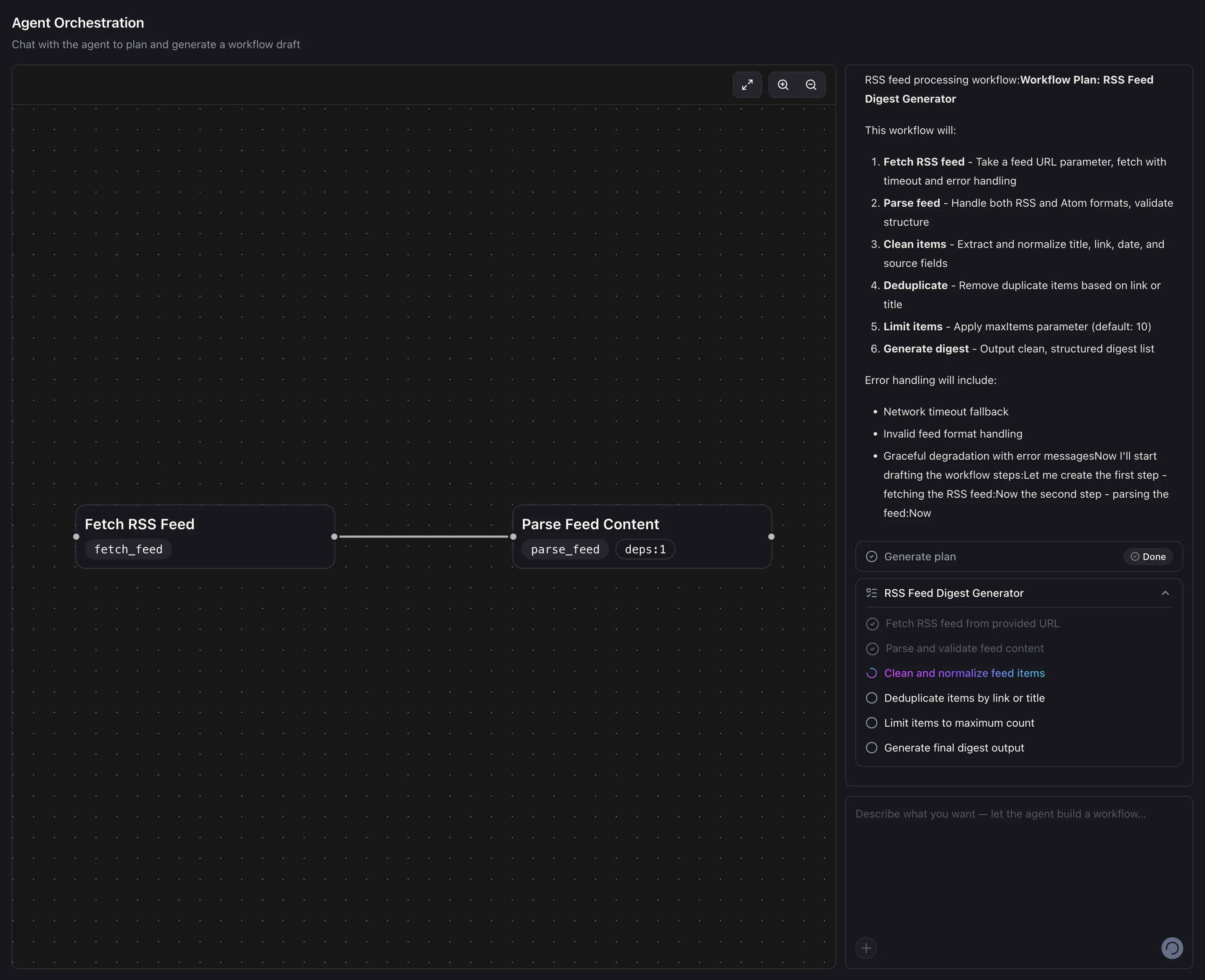 Section titled “Agent Orchestration”I used AI to generate a workflow that fetches RSS data and analyzes it.
