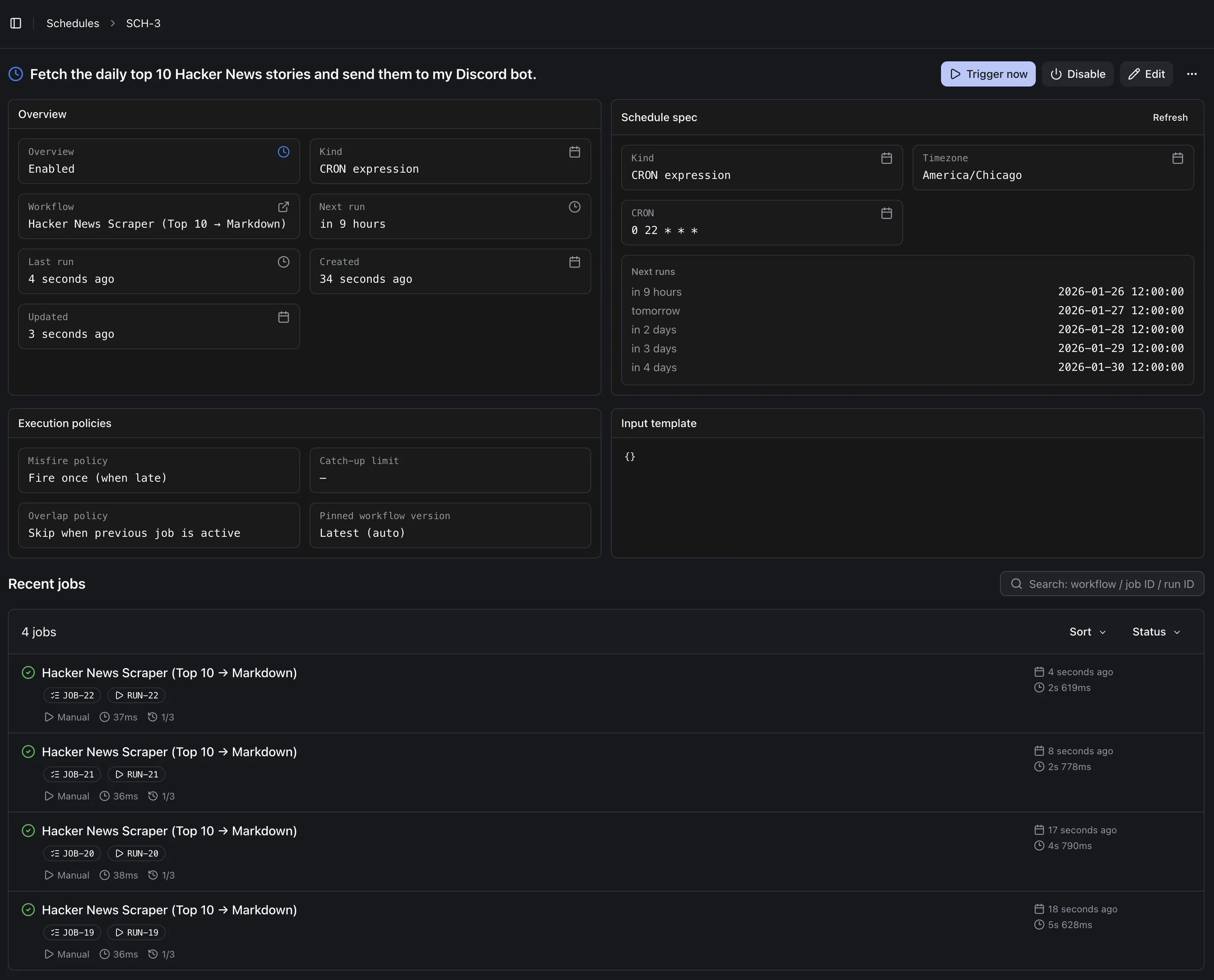Section titled “Schedules”I can also set up schedules to trigger tasks daily—for example, fetching the top 10 Hacker News stories and sending them to my Discord bot.